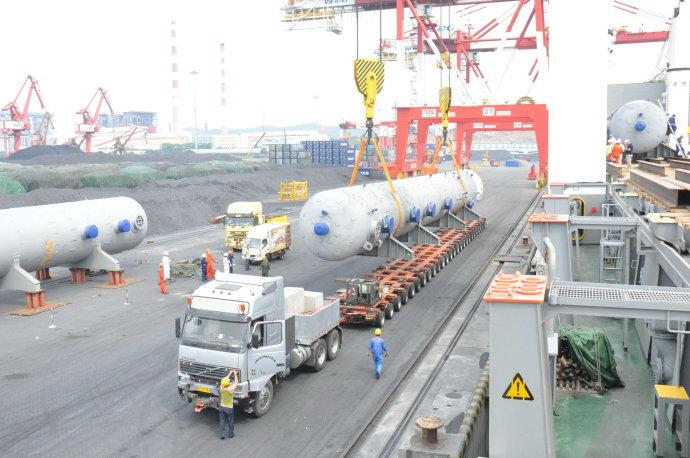 All heavy cargoes were unloaded by heavy-lift vessel onto the barges/trailers at port and transshipped to private jetty / jobsite for roll-off and delivery to the site after intermediate storage.